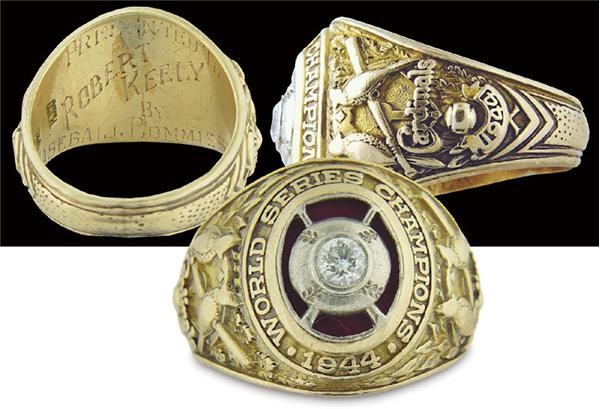 All-important and coveted prize from the “St. Louis Showdown”. The centerpiece is a .5 karat diamond embedded in a baseball and bats design surrounded by raised lettering that reads, “1944 World Series Champions”. Decorating both the left and right shank is the team’s logo birds in addition to “Cardinals 1944”. Engraved along the inner portion of its 14K gold band is, “Presented To Robert Keely by Baseball Commissioner” and “HJCO”. Size 10.5. Excellent condition. LOA from Keely's brother.
