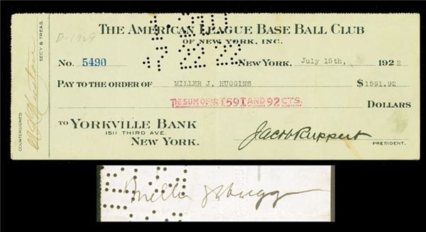 Pinstripe payroll check paid to the order of Miller J. Huggins in the amount of $1,591.92. Signed by Jacob Ruppert and endorsed on the verso by Miller Huggins. His first name is interrupted three times by holes in the stamp, but black fountain pen ink is dark with almost no fading. Check itself measures 3.5x9”, in VG-EX condition.