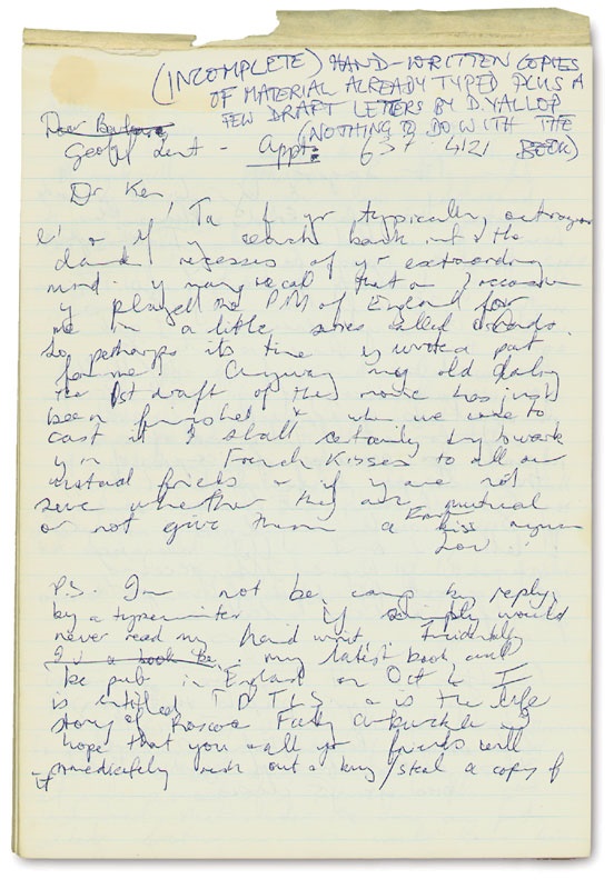 19 total pages, filled with handwriting includes copies of typed text, character profiles, commentaries, colorful stories, and true accounts straight from the mind of Graham Chapman. Most likely written while he was attending Cambridge University. A great window into the vivid imagination of the creator of the cult classic known as Monty Python’s Flying Circus. The first page is marked, “(Incomplete) hand-written copies of material already typed plus a few draft letters by D. Yallop (nothing to do with the book).” The writing is, of course, pervaded by satire and contains a commentary on the town of Cambridge and the university grounds, colorful fictional stories illustrated with sound-effects, as well as true accounts. One involves Paul McCartney and the Hard Rock Cafe in Piccadilly and incorporates Chapman’s own commentary and philosophies on society at large with the use of sarcasm.