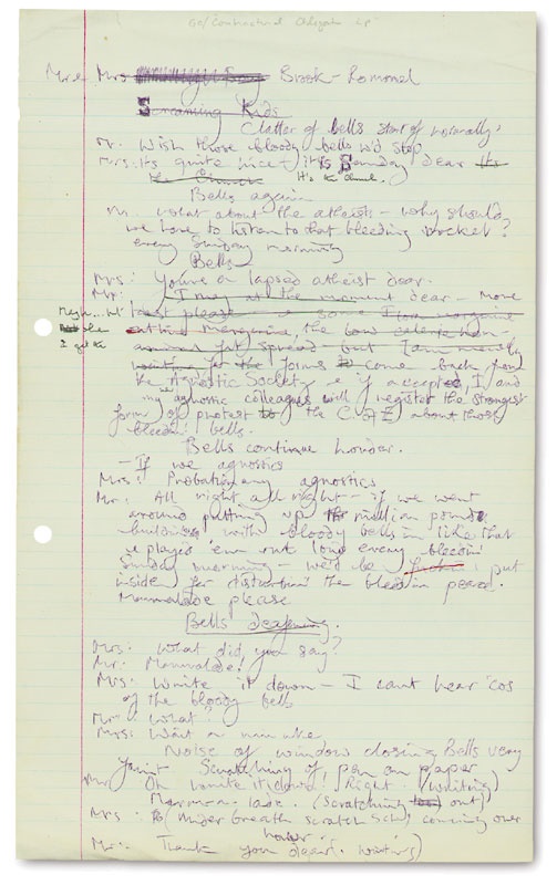 A fresh look into the rudimentary dabbling of the late Graham Chapman. Partial story was penned by Chapman of the British comedy troupe, Monty Python. From the "Contractual Obligation" LP, this single page (8x13”) contains a story entitled, “Mr. & Mrs. Brook-Rommel” that was actually recorded on that album. The two characters (a married couple) are engaged in an entertaining philosophical dialogue providing Chapman’s commentary on the practices of modern Christianity (one of Chapman’s favorite subjects). Notebook paper is EX.
