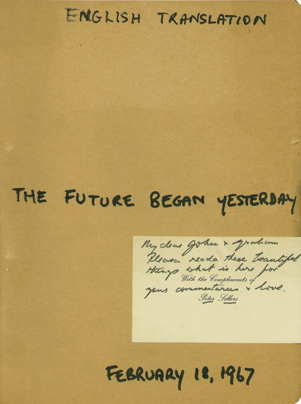 Presented is an English translation of a script entitled, “The Future Began Yesterday” from “Storie Naturali” by Damiano Malabaila. It was presented to John Cleese and Graham Chapman from actor, Peter Sellers, who is most remembered for his role in the Pink Panther films as Inspector Clouseau. Included is the handwritten card which reads, “My dear John & Graham, please read these beautiful things what is here for your commentaries & love.” The 3x5” card is also imprinted, “With the Compliments of Peter Sellers.” The script is dated February 18, 1967 and contains a keen observation on the dangers of industrialization in modern society. EX. Damiano Malabaila was actually a pseudonym for Primo Levi, known primarily for his accounts on the Holocaust. He wrote “Storie Naturali” under the name Malabaila on the advice of one of his editors.