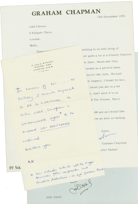 A collection of seven letters, 5 typed, then signed and two handwritten, with great content regards to various Monty Python productions as well as personal business among the members of the British comedy troupe. Includes two letters signed by John Cleese, one by by Michael Palin, two by Eric Idle, one by David Frost, and one by Graham Chapman dated Dec. 13, 1976: “Hullo, Three what are called ladies (something to do with being of a different *gender, I think) helped us out quite a lot at a Charity Concert. They’re called by effeminate names like Anne, Hazel and Judy. Well anyway, I sent them 1 oz. pots of caviar as a present from four of us, i.e. people with dead butch names like John, Michael, Graham and Terry, (though Terry is a bit suspect, I think) (in fact, I know someone with a wife called Terry) (mind you she is a bit butch) (please burn this letter) (or at least, don’t send it in an envelope addressed; Mrs. Barry Cryer, 10th Avenue, Hatch End Middlesex.) Well anyway, this gesture cost me 12.00 pounds and so I would like 3.00 pounds from each of the people mentioned above as soon as fucking possible. Love, Graham. *Gender - To produce the “D” is excrescent. Shorter Oxford English Dictionary.” All letters done on letterhead or personalized stationary. EX to EX-MT.