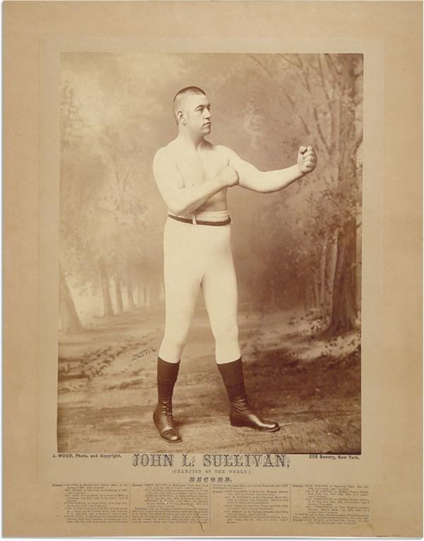 Boston fans remember him as “The Great John L.” An outstanding photo of the Boston Strongboy, John Sullivan. The last of the bare-knuckle champions, Sullivan is posed for this in studio photo wearing his ring gear with his dukes up. Fabulous contrast and its imposing size makes this one impressive vintage photo. Copyrighted 1885 with the artist’s cartouche (John Wood, New York). Mounted on cardboard which is printed with Sullivan’s fight record below. Photo itself is in NRMT condition. Matted to 18x23” and wooden frame measures 24x28”.