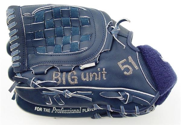 A gorgeous gamer from one of the most gracious superstars in the game today who led the expansion Arizona Diamondbacks to glory in their 4th year of existence. The Big Unit is capable of single-handedly winning a game at any given time, his prowess shown in his strikeout totals and ERA. To watch his perfected craft on the mound is to witness extreme domination. He is everything you look for in a pitcher: focused, powerful, intimidating and usually unhittable. Blue Rawlings glove shows nice use, decently broken in with stadium dirt stains still in the palm. Signed in silver sharpie on the inside of the ring finger (slightly bled). “Big Unit 51” embroidered on the outside of thumb. The glove also sports his patented wrist band wrapped around the back strap with “the Big Unit” embroidered in white.