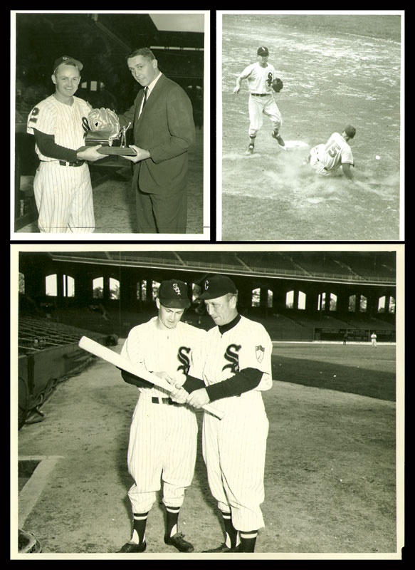 A fabulous set of original and vintage 1950’s black & white photos from the personal collection of the Chicago White Sox Hall of Fame second bagger, Nellie Fox. Varying in size from 5x7” to 8x10”, many wire photos, consisting of mostly action shots in Comiskey Park. Includes numerous double plays in the making, Mickey Mantle sliding safely into 2nd base, Fox & Busby doing ad for “National Bohemian” beer, great photo of Fox with Minnie Minoso in suits, & two of Fox accepting Gold Glove award (1957). Photos are mostly EX-MT, with a few that qualify as VG-EX.
