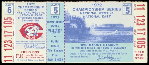 His was perhaps one of the most mourned losses in Puerto Rican history. Hall of Fame hero Roberto Clemente was killed in a plane crash en route to a relief effort, organized by him, to help the earthquake victims in Managua, Nicaragua. Offered is a full, unused ticket to his last game - Game 5 of the 1972 League Championship, in which the Cincinnati Reds knocked the Pittsburgh Pirates out of World Series contention despite a single and homer from Roberto Clemente. Box seat ticket for row 17, seat 105 boasts photo of Riverfront Stadium. Excellent condition with one set of staple holes and minimal damage otherwise.