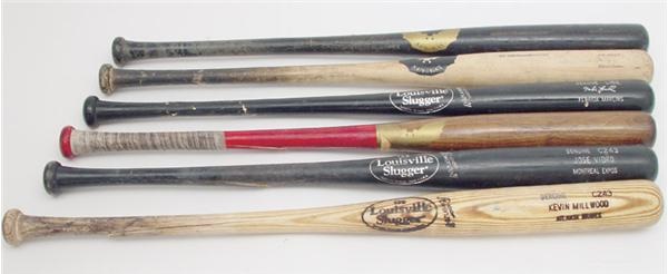 Outstanding lot of game used bats from the modern era. Each shows very strong use (unless otherwise noted) and almost all are cracked. 1.Vladimir Guerrero cracked 2002 Sam Bat,“27” written on knob with what appears to be another number on top. 2. Tim “Rock” Raines 2001Louisville,light use, uncracked. 3. Jose Vidro 2002 Louisville cracked. 4. Two Mike Lieberthal Louisville Sluggers cracked. 5. Jeromy Burnitz Louisville T141 cracked used with New York Mets. 6. Jeromy Burnitz Easton 141C used with Kansas City Royals cracked. 7. J.D. Drew 2002 Sam Bat heavy use cracked. 8. Randy Wynn 2002 Louisville cracked. 9. A.J. Pierzynski 2003 Louisville uncracked. 10. Mike Lowell 2003 Louisville cracked. 11. Brad Fullmer 2003 Louisville light use uncracked. 12. Steve Finley 2002 Sam Bat cracked. 13. Kevin Millwood 2002 Louisville cracked.