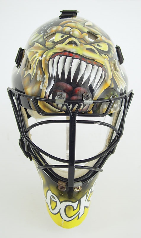 Blaine Lacher’s game used goalie mask worn for the Boston Bruins 1995-96 regular season. The mask is beautifully painted with the Loch Ness monster on top holding Bruins pucks with the word “Locks” painted on the chin. Painted by famed mask maker, Dominic J. Malerba, it is autographed by the artist. Shows good game use with salt and rusting in the bolts, plus sweat stains on the inside.