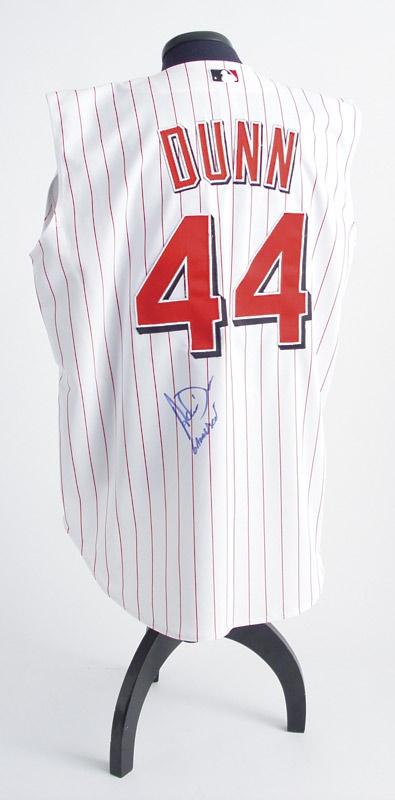 A young power hitter with Hall of Fame type potential. You gotta love it. Cincinnati Reds home white pinstripe was worn by Adam Dunn during the 2002 season in which he squashed any possibility of a sophomore slump. Sleeveless style is a throwback to the early1960's uniforms. Right breast displays his number “44” in red on white on black 3-D numbers. Reds team logo sewn over the heart. Verso is “Dunn” in arched lettering with his number” “44” below in the same 3-D style. Official red white & black MLB logo embroidered just below collar line. In recognition of his own gamer, Dunn has signed on the back in blue sharpie, “Adam Dunn - Game Used.” Front left tail tagging is “Russell Athletic Authentic Collection.” Additional “Russell [size] 48” flag tag in collar. Light use.
