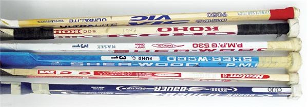 Six game used sticks from the best goaltenders ever to step between the pipes. Included are: 1) Grant Fuhr - Blue Sher-Wood, great condition. 2) Martin Brodeur - CCM Heaton, NR-MT. 3) Patrick Roy - Koho 500, NR-MT. 4) Curtis Joseph - Bauer R6000, stamped “001129 03”, great shape, signed 5) John Vaniesbrouck - Vic 9050, signed, NR-MT. 6) Dominik Hasek-Sher-Wood G530 signed, great use.