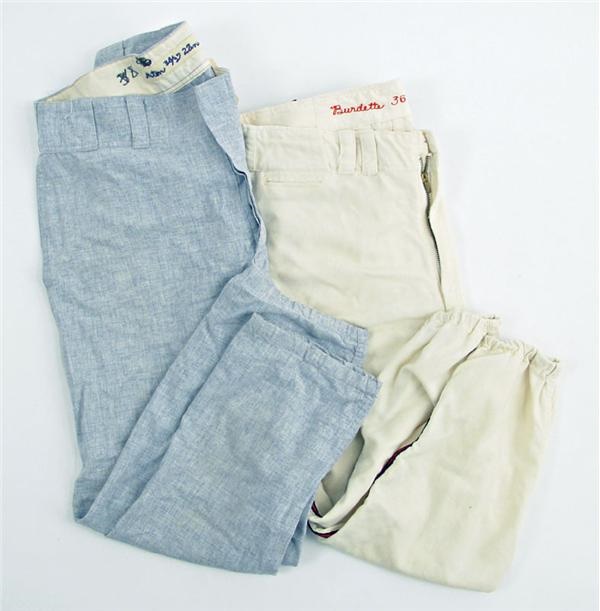 A great pairing from two of the most impacting hurlers in baseball history. Lew Burdette, one of the cockiest and most talented pitchers ever to take the mound wore these home white California Angels uniform pants in his last year as a player. Nice use with “Burdette 36 27 ins” embroidered in red thread on plate in the back of the waistline. To its right is the “Rawlings [size] 36” tag with care instructions on separate tag. A plate for the year, also in the waist is embroidered “67”. The other pair, worn by Hall of Fame Brooklyn Dodgers manager, Walt Alston are gray road with “Alston 38/37 27 ins” embroidered on felt plate in the back of the waistline. Two crossed out numbers are handwritten in black marker next to it. Also in the waist on the right hip is the “Rawlings [size] 38” tag with “set 1 1964” flag tag and care tag to the right. Nice use.