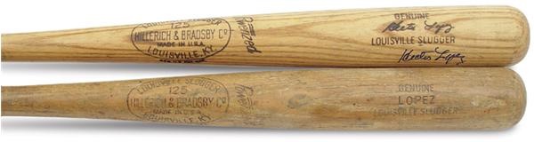 A nice pair from the New York Yankees reliable outfielder and pinch hitter. Both bats were used with the Yanks. The first, a 1959 Hillerich & Bradsby M110 (34.5”) shows extensive use and wear from his very first season with the Bronx Bombers, the same year he was traded from the KC Athletics. Slight splintering on the barrel. Handle is cracked, but held intact by vintage black grip tape. His number 11 painted in black on knob. The second, a 1960-64 H&B R43 (35”) was used during the Yanks’ 5-straight pennant winning stretch. Nice use with ball marks on the sweet spot. Grooves have been carved into the wood on the handle, most likely by Lopez himself, as a way to ensure a good grip. His number 11 painted in red on knob. To top it off he has placed a nice blue sharpie signature right under his stamped signature on the barrel.