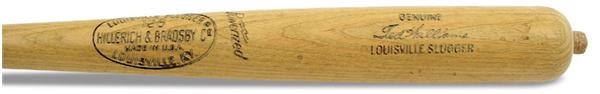 Hillerich & Bradsby W215 was wielded by the last .400 hitter in baseball. A few years removed from his playing career, Teddy Ballgame used this piece of lumber while instructing his descendants on the art of hitting. Signature model shows light but definite use and is distinguished by a piece of the wood center protruding 1/2 inch out of the end of the barrel. “W215” stamped on knob.