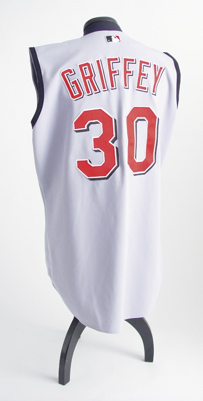 The illustrious career of Ken Griffey Jr. cannot be denied, despite his current state of injury. Keep the faith, he belongs in the Hall of Fame anyway you slice it, and this sleeveless Cincinnati road gray jersey is still a great piece of equipment. “Cincinnati” across the chest in 3-D style red on white on black tackle twill. His number “30” below the heart. Verso is “Griffey 30” in same style. Official MLB logo embroidered just below the collar line. Sleeve holes are done in stylish black trim. Tagging on front left tail is “Russell Athletic Authentic Collection” with “[size] 46 100% polyester”, “+2” extra length” & “-1” body taper” flag tags. “Property of Cincinnati Reds” printed on separate tag. Light use.