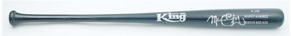 Sleek black King K200 was wielded by one of the most lethal weapons to hit the Majors, Manny Ramirez. This guy is money in the bank. Nice use with a smattering of ball marks on the barrel, capped by a strong silver sharpie signature. His number 24 written on the end of the barrel.