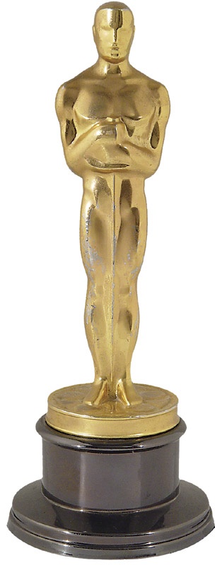 Most highly coveted Academy award, the movie industry’s ultimate prize. This is the symbol of achievement all little boys and girls of Hollywood grow up dreaming one day to acquire for their mantelpiece. And now you can have one for your own mantelpiece. This Academy award is missing the band with engraved dedication around the podium, leaving the identity of this 13” tall golden sculpture anonymous, but its significance is undeniable and unmistakable. Sure to command attention wherever it ends up, this golden naked guy is marked with the number “2268” stamped onto the back edge of the stand connecting him to his black podium. Some surface scratching and chipping, o/w EX.