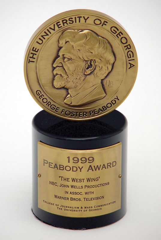 The broadcast and cable industry’s most prestigious prize, the George Foster Peabody award is a 6.5” tall trophy, a black cylinder with 1/3” thick golden coin sitting on top which boasts the raised bust of George Foster Peabody, the philanthropist for whom the award is named. He is surrounded by engraved lettering, which reads, “The University of Georgia, George Foster Peabody.” Design on verso is Roman columns surrounded by the words, “Awarded by the University of Georgia - Et Docere et Rervm Exqvirere Cavsas.” In Mint condition, this was presented for NBC’s “The West Wing” in its debut season at the 59th annual 1999 George Foster Peabody awards ceremony. Affixed plate on front reads, “1999 Peabody Award ‘The West Wing’ NBC, John Wells Productions in Assoc. with Warner Bros. Television, College of Journalism & Mass Communication, The University of Georgia.”