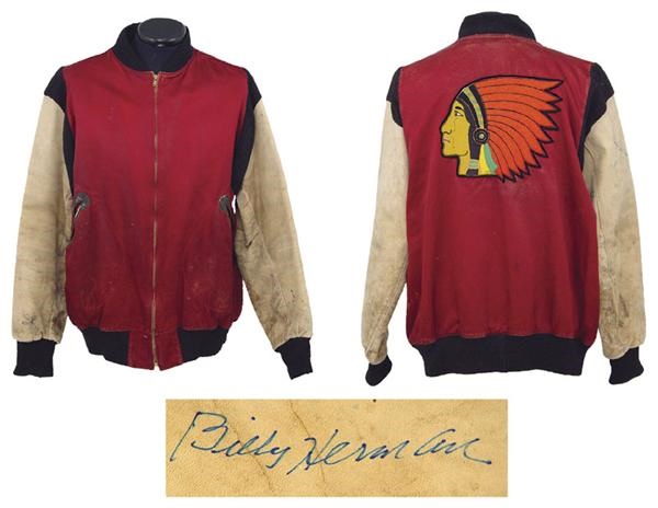 Leather and suede jacket belonged to Hall of Famer, Billy Herman during the 1946 season when he played for the Boston Braves. Zip-up is a colorful garment adorned with an elaborate and large Braves Indian patch on the back. Signed in blue felt tip on the left sleeve. “Herman” is sewn in maroon colored thread just inside of the zipper on the front right lapel. “10” printed on two tags on inside of the opposite lapel. Collar tagging is “Wilson [size] 46”. Jacket shows good use and wear. This jacket was also worn by former 1946 Boston Braves teammates, Phil Masi, Danny Lithwhiler and Earl Reid. LOA from Herman.