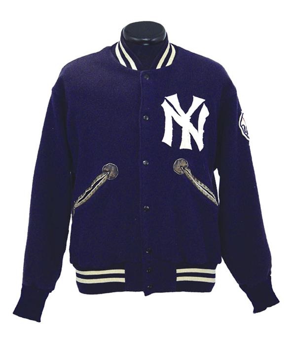 This is absolute vintage Bombers! Snap-up jacket made of thick navy wool is covered with Yankee pride, all 1960’s from one of the most popular teams in recent history. “NY” logo embroidered on left breast and circular felt Yankees team patch on left sleeve. Judging from the faded number “12” written in black marker in the collar, this jacket was probably made for player Mike Hegan or Phil Linz, but was most likely worn by several Yankee teammates. The Yankees patch on the sleeve is slightly detached at the top of the circle. Tagged on inside tail with “MacGregor [size] 46” with a flag tag that has been worn completely blank and falling off. Otherwise the jacket is in beautiful condition, especially the interior. The outside displays the expected use and wear for a vintage garment of its caliber.