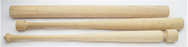 These three pieces of wood from Rawlings were used as an in-store display, illustrating the bat making process. Each of the three pieces measures 37 inches from tip to tip. The first piece in the procession is a perfect cylinder - the starting point for all bats made by Rawlings. The second is the cylinder with the tapered handle carved into it. The third piece is the near finished product with the shape of the knob and the end of the barrel defined, but still with the excess wood attached to the ends. Would make a nice addition to your bat display. A great conversation piece.