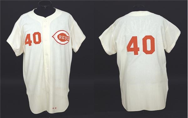 1969 Cincinnati Reds home jersey represents the revival of the short-sleeved home jersey, a three-year style marking the glory days of the Big Red Machine. Plain white with the embroidered Reds logo on the left breast and Tony Cloninger’s number 40 sewn on right breast in red tackle twill. The verso displays the large number “40”, the name has been removed, but the thread used in the arched lettering has left a visible outline of his name. Embroidered on the front left tail is “46” denoting the size and “69” denoting the season. Tagging sewn onto the inside seam of the front right tail is “Rawlings [size] 46” with care tag to its right and “set 1 1969” flag tag. 100th Anniversary patch has been removed from the sleeve. The jersey displays excellent use and wear, in nice condition.