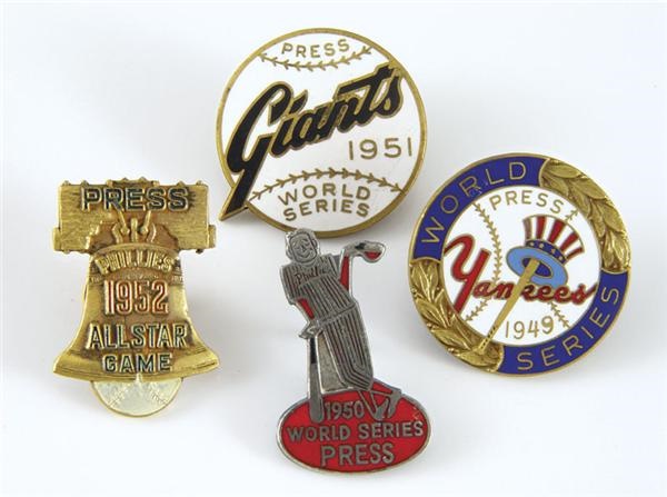 A very special collection of four press pins, unseen in this type of condition with extras. Highlighted by a Mint 1949 New York Yankees World Series pin. Enameling and the pin are exquisite and come with original pin back and paper Dieges & Clust backing (EX-MT). This particular treasure is unknown with these “extras”: the original “D&C” envelope from the manufacturer and the original tissue paper protecting the pin back (EX). 2. 1951 New York Giants World Series pin obtained from a former Cardinals owner. Condition-wise, this is the best we have seen. With original Dieges & Clust paper backing. EX-MT. 3. 1952 All Star Game “Phillies” pin. Another beauty in the shape of the Liberty Bell with baseball pendulum enameled white. Manufactured by William C. Martin with original pin back in Martin box. Lettering on the pin done in red, white & blue. EX+. 4. 1950 Phillies World Series pin by Martin Sterling. Pin is smiling Whiz Kid in uniform. EX. These were obtained from a former St. Louis Cardinals owner.