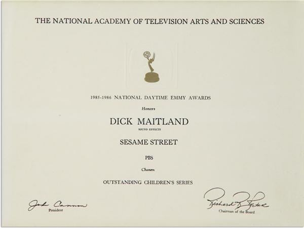 Gold-framed award plaque from “The National Academy of Television Arts and Sciences” was presented to Dick Maitland for “Outstanding Children’s Series.” Paper is printed with a miniature image of the Emmy Award and the words, “1985-1986 National Daytime Emmy Awards Honors Dick Maitland (sound effects) Sesame Street PBS Chosen Outstanding Children’s Series.” Stamped with facsimile signatures from President Cannon and Chairman of the Board, Rector. EX-MT condition.
