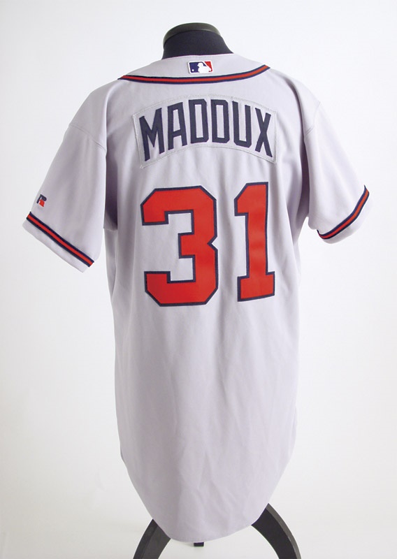 In a class with Cy Young, Greg Maddux is the proven and true model of consistency and control. Road gray Atlanta Braves jersey is the latest in great game used equipment from this Hall of Fame lock. “Atlanta” streaks across the chest with the tomahawk logo below. Verso is “Maddux” on arched nameplate and his “31” below. Official MLB logo embroidered just below the collar line. Front left tail tagging is “Russell Authentic Collection” with “[size] 46 100% polyester” & “+2” extra length” flag tags. “1-2003” printed on separate tag. Light use.