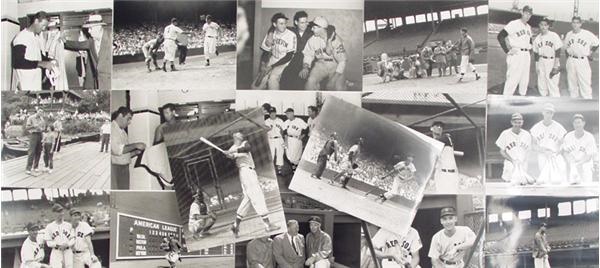 A fabulous array of vintage negatives from the start of Ted Williams’ career on the Boston Red Sox through 1955. Twenty timeless quality shots of vintage Teddy Ballgame to create the ideal shrine for the Boston immortal. All the following images were taken in Fenway Park: 1. Williams with Bob Feller & Charlie Wagner in 1941 (all smiling). Feller led the league with a 25-13 record. 2. Williams walking at Fenway in front of photographers who are lined up on the first baseline with cameras (1955). 3. Warming up in the batting cage (2 different). 4. Running in front of the old scoreboard with trainer in 1954. 5. With Sam Mele & Dom DiMaggio posing in full uniform. 6. With Wally Moses & Dom DiMaggio posing with bats in front of dugout. 7. Classic home run swing. Both the catcher and the umpire gaze upward in awe, as Williams makes his move toward first, dropping his bat. 8. Standing alone with bat & warm-up jacket. 9. With Naval personnel after being sworn in to the service. 10. Signing autographs for soldiers at Fort Devens (1942). 11. Receiving new jock strap in locker room. 12. Getting greeted at home plate by Bobby Doerr after rounding the bases (1942). 13. With arms around Army & Navy baseball players at Fort Devens. That is Bob Feller on his right (1942). 14. Out of uniform - going on fishing trip with his daughter, Claudia. 15. Out of uniform, getting his shirt fixed in the locker room. 16. Standing in full uniform with 2 other Red Sox players plus Bill Mckechnie & Lou Boudreau on Fenway's infield. 17. Williams with Joe Cronin and trainer. 18. With Charlie Wagner. 19. With Stan Spence in 1946 (2 different). Spence led the league in doubles that season. 20. With Bob Doerr. Each negative measures 4x5”. Excellent condition.
