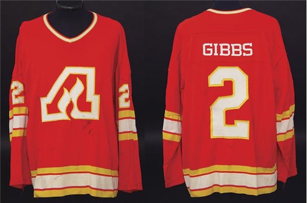 Atlanta Flames road jersey worn by Barry Gibbs. Adorned with the “A” team logo with flames design sewn on the front in red on white on yellow tackle twill. Verso is “Gibbs” in unique, extra thin white block lettering on straight nameplate. His number “2” is displayed large on the verso and on each sleeve. Collar tagging is “Rawlings [size] 48” with a “2” shorter” tag below. Great game use is evident throughout in the form of “tracks” from points of contact, but few team repairs on the elbows and forearms. In fine display condition.