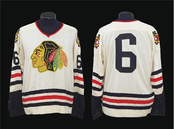 White durene jersey with elaborate Indian head on the front, which boasts a pleasing braided embroidery in multi color. Braided embroidery is also used on the team patches on each shoulder. The verso and the sleeves bear the number “6” in black tackle twill. Nice use with a few team repairs to right arm. Collar tagging is removed. Here is the players that wore this number during this era: 1965-66,1966-67 Lou Angotti, 1967-68, 1968-69 Bill Orban, and Lou Angotti again in 1969-70.