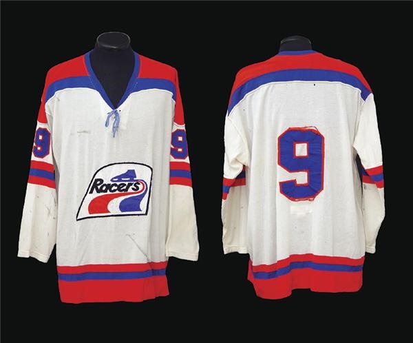 From the long defunct WHA Indy Racers comes this vintage 1970’s gamer. Home white jersey with “Racers” team design sewn on the front in red, black & blue tackle twill. Stylish and vintage neck tie style with the original laces intact. Verso bears the number “9” in blue on red tackle twill. The number is well worn and has started to separate from the jersey at the top and the bottom. Each sleeve also displays the number “9”. Collar tagging is “Rawlings [size] 48”. Extensive game use has left the scars of battle in the form of “tracks” and small holes in the dureen fabric. Very few team repairs.