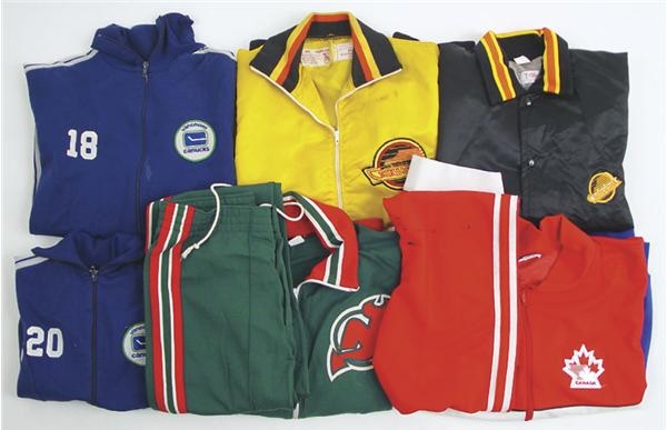 Awesome set of trainers worn jackets, some with pants, from the following NHL teams: 1. Vancouver Canucks (4). Two Adidas blue nylon / cotton zip-up jackets, one with the number "18" screened on the right breast in white, the other with the number "20". Each with blue & green "Vancouver Canucks" circular patch over the heart. Both with "Adidas" tags in the collar, one with [size] "3" flag tag, the other is size "8". Two snap-up jackets with "Canucks" patch sewn onto the left breast. One yellow, one black. 2. Team Canada polyester / cotton jacket and pants. Jacket is red white & blue zip-up "Pace Setter" and "CCM" embroidered onto the right breast. Left breast bears the Team Canada leaf emblem. "Pace Setter" and care tags in collar. Nice use and "Ken F." written in black marker on inside. Pants are red with white stripes. "CCM" flag tag on inside seam with care instructions. Nice use. 3. New Jersey Devils jacket and pants. Green with red & white striping. Jacket is zip-up with NJ Devils team logo sewn onto left breast. Size XL. Care tag in collar. Pants are tagged on inside seam, "O'Shea" with care flag tag. Nice use.