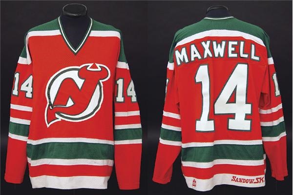 Without a doubt one of the most attractive hockey jerseys out there, this red mesh Devils jersey with green & white trim was donned by Kevin Maxwell in the 1983-84 season. Large NJ Devils logo on the front in red, white & green tackle twill. “Maxwell 14” on verso in white on green tackle twill. His number “14” displayed on each sleeve as well. “Gerry Cosby” and “Sandow SK” screened onto the white trim of the back tail. Collar tagging is “Gerry Cosby” with care tag to the right and [size] 54 tag to the left. Evident use and wear, but no team repairs.