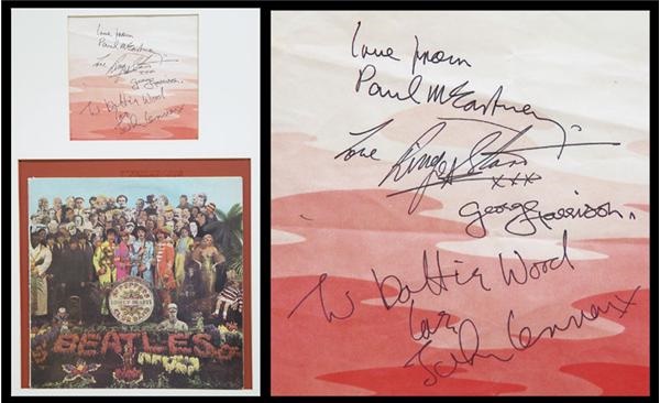 Vintage inner sleeve is signed by all four Beatles. This custom designed red, faded into pink and white inner sleeve marks an important distinction in the Sgt. Pepper album covers. It is significant in that it is only seen in first printings of “Sgt. Peppers Lonely Hearts Club Band”. Subsequent releases of Sgt. Pepper did not have this color scheme. Previously, Capitol Records had been using a sleeve which advertised 54 of its other albums on the market. Matted above the actual album sleeve is the slightly wrinkled inner sleeve (matted to 7.5x7”) which proudly displays the black felt tip signatures: “Love From Paul McCartney” at the top, with “Love Ringo Starr XXX”, “George Harrison”, & “To Baltic Wood love, John Lennon” below. Superb contrast due to the boldness of the signatures against the white and pink of the sleeve (grading a “9” out of a possible 10). A most rare and treasured piece.