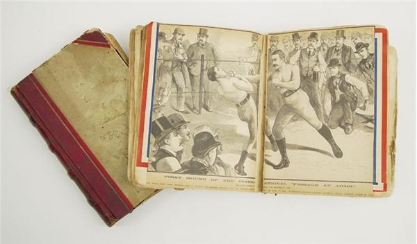 One of the finest scrapbooks you will ever see. 15x12” behemoth is a couple of hundred pages in length and filled with hindered of clippings of the Great John L. as well as all the other great fighters of the era. There are Police Gazette engraving from such bouts as Sullivan-Kilrain, Sullivan-Muldoon (wrestling), Sullivan-Mitchell, Dixon-McGovern. Fitzsimmons-Dempsey, Corbett-Mitchell, Corbett-Fitzsimmons, and more. Also, Billy Mitchell’s supplements and several full page homages to John L. Bad binding and coverless o/w Good. Also, matching 1920s-30s entertainment scrapbook. Wonderful movie mag clips from Lon Chaney to the Barrymore's.