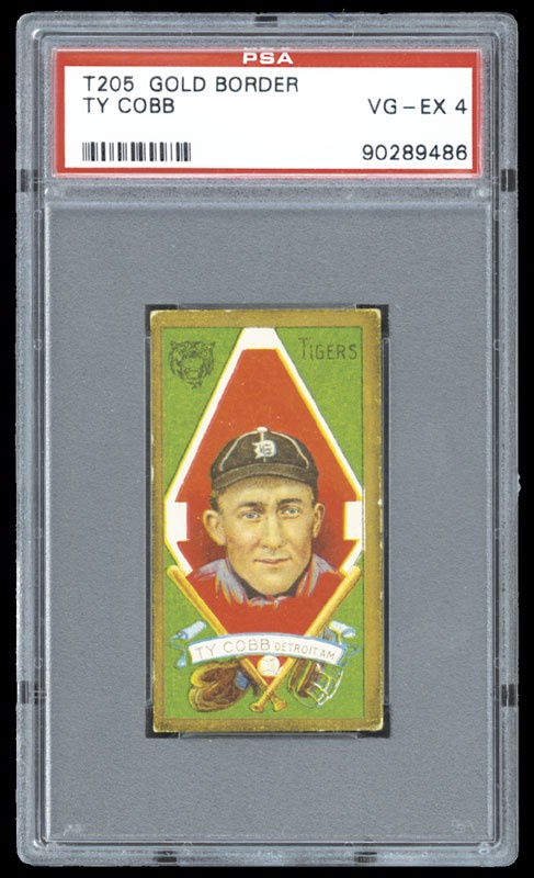 Piedmont back. There are no creases present. It exhibits even corner wear. A deep gold color frames this beauty. Cobb’s picture is set against a rich colored red background. The key to the T205 set.