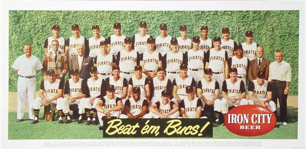 Clemente, Groat, Hoak, Law, Mazeroski, Burgess, Stuart and Friend all flash their pearly whites for Pittsburgh’s favorite brew on this awesome advertisement for “Iron City Beer”. The bright whites of the uniforms and the plush green ivy of the outfield wall at Forbes burst of the surface in vivid color, combine that with the sharp corners and borders and the result is an EX-MT grade. The perfect keepsake from that memorable see-saw World Series of 1960 during which Steel City knocked off the Yanks for their first title since 1901.