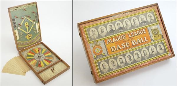 The faces of Cobb, Loajoie, Speaker, Chance, Mathewson, and Speaker are just a few to adorn the cover of this classic, early 20th century table game. Open the oak case to reveal a colorful playing field, complete with all of its original pieces. Created by the Philadelphia Game Manufacturing Company and measuring 19.5x13.5x3”. Some minor paper loss on cover and general wear to the game’s exterior, otherwise VG-EX.
