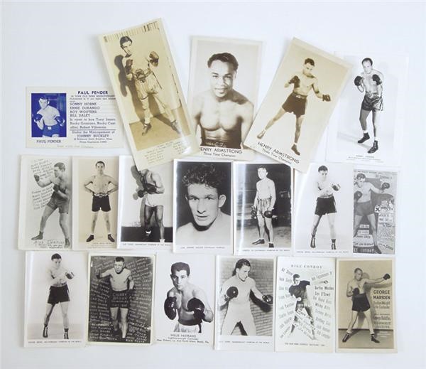 Wonderful ad cards that advertise these great fighters of the time are all vintage. Includes some great champions and contenders including Joe Louis, Paul Pender, Henry Cooper (Clay era), Kid Berg, Willie Pastrano, Terry Allen (Champion), Fritzie Zivic (2), Billy Conn, Lew Jenkins, Lou Ambers, two Mike Conroy (“the man who stopped Battling Siki”), Mike Dempsey (lists opponents Joe Gans, Mickey Walker, etc.), Henry Armstrong (2), George Marsden (a beauty!), and many more. Most postcard sized and overall EX+. Many are from the collection of British manager Johnny Sharpe and are real photos.