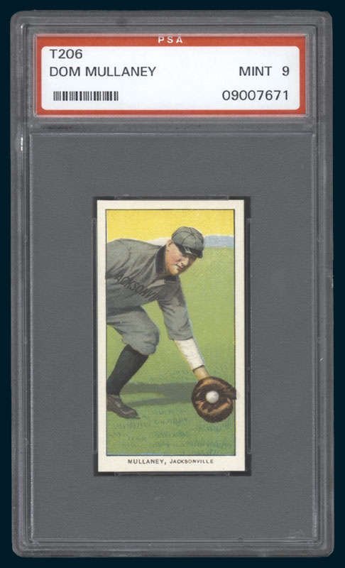 One of the scarce existing images of the ancient South Atlantic Leaguer, Dom Mullaney is this outstanding T206, graded PSA 9 Mint. Exquisite in every way, from its beautiful corners and perfect centering, to its rich bold coloring which has suffered no fading despite its centurial heritage. Old Mill cigarette ad on verso is equally as stunning. Only one example graded PSA 9 to date with no PSA 8’s graded at all.