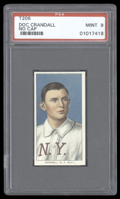 The finest that this elusive set has to offer, this gorgeous Mint 9 example of the first dominant reliever in baseball boasts 4 sharp corners and ebullient colors to match. Without cap and sporting the New York jersey he would don while helping the Giants to 3 pennants (1911-13), Doc Crandall poses proudly for this classic century old Piedmont cigarette byproduct. One of two example graded PSA 9.