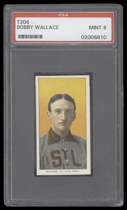 A stunning Mint example of the St. Louis Browns Hall of Fame shortstop. Graded a "9" by PSA standards, this classic tobacco card exhibits the richest and boldest colors with extremely crisp corners. Nicely centered (60-40) with impeccable Piedmont Cigarette graphics on verso. One of two examples to date grade PSA 9.