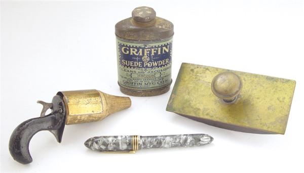 From one great collector to another, these fantastic items were once part of Houdini’s extensive magic collection kept at his 113th Street home. Presented is his: 1) “Griffin” suede powder in its brass tin 2) Grey marble “trick” pen 2) 5.5” steel and wood gun with brass cover that is stamped but illegible 4) 5” brass and wood blotter. Each unique piece is in Ex condition or better.