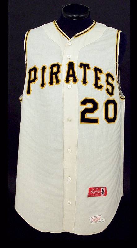 A great vintage Pittsburgh Pirates flannel vest gamer. This could be one of two jerseys: worn for an Old Timers game by Pie Traynor, or Richie Hebner’s first Pirates jersey. Either way, it is a highly desirable representative of the late ‘60’s style Pirates jerseys, in top display condition. “Pirates” across the chest in black on yellow felt lettering and the number “20” below the heart. Verso is the number “20.” Tagging on front left tail is “Rawlings [size] 44” with care tag below and “set 1 1968” flag tag. Use is light.