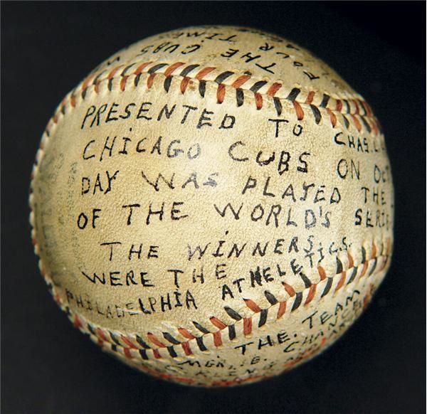 Shortly after the final out of the series Cubs hurler, Bill Foxen, sat down with pen in hand and created this one of a kind keepsake. Inscribed on a blue and red stitched, Spalding ONL ball is the following: “Presented to Chas L. Hansen by Foxen of the Chicago Cubs on Oct 23, 1910. On this day was played the last and final game of the World Series of 1910. The winners were the Philadelphia Athletics. The Results: Phil. Won-4 Lost-1 Chic Won-1 Lost-4. Covering the opposite panel is: “The Cubs were four times National League winners and two times Worlds Champions: 1906- Nat. Champs, 1907-Worlds Champs, 1908- “ ”, 1910- Nat. Champs.” Continuing on: “The Team Mgr/1B-Chance, C- Kling and Archer, SS- Tinker, 2B- Evers, 3B- Stienfelt, LF- Sheckard, RF-Shulte, CF-Hofman. Pitchers- Brown, Overall, Ruelback, Pfiester, Cole, Foxen, McIntyer, Richie, Weaver, Zimmerman, Kane. Stamped in orange “TJ Lynch 1910”. Additionally it is one of the first cork-centered balls to be used by Major League Baseball, used in play for the first time ever during this series. Toned from age with minor chips and scuffs to the surface. Overall an exquisite ink specimen and a brilliant addition to any game used ball collection.