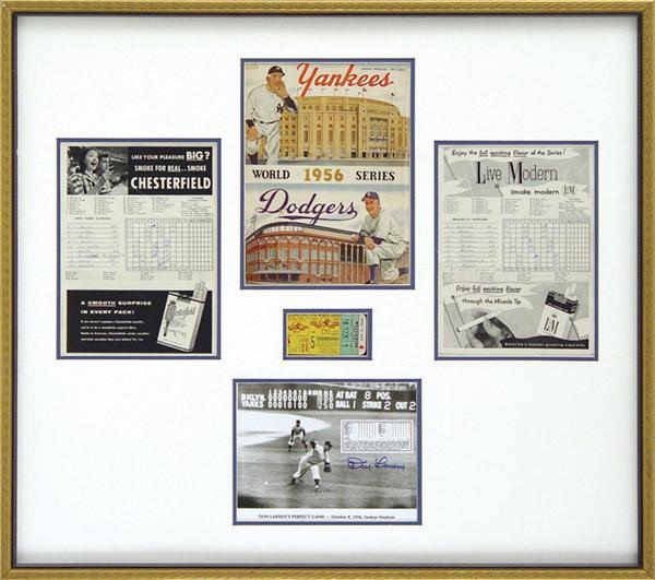 A great way to remember the day Don Larsen was perfect - the performance for which he was immortalized. On the world’s stage, during the most watched sporting event in the world, Larsen summoned the pitching gods to carry him through the most meaningful and amazing performance of his career. No player ever in Series history since (or previous) has been able to match that incredible perfect game against the Brooklyn Dodgers. Framed display contains a 1956 World Series program, a mezzanine ticket to Game 5 at Yankee Stadium, two perfectly scored pages (one for each club) from that historic game, and a signed black & white photo of Don Larsen’s perfect game. Blue sharpie signature is a perfect “10”.