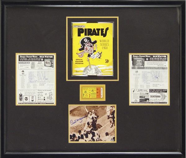 The perfect tribute to Bill Mazeroski’s greatest moment. Framed display contains a 1960 Pittsburgh Pirates program (EX), with two perfectly displayed scorer’s pages (one for each team), a box seat ticket to that historic Game 7 at Forbes Field, and a signed 8x10” photo of Maz crossing home plate after hitting the most memorable blast in World Series history. Signature is a perfect “10”. LOA.