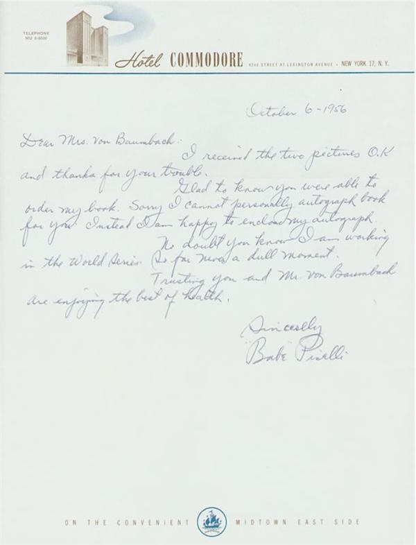 Handwritten letter from major league umpire, Babe Pinelli (D-1984), is dated 2 days before he umpired in the most important World Series Game of his life, Don Larsen’s gem against the Brooklyn Dodgers. That would be Pinelli’s last official game as arbiter. What a perfect way to end a 22-year career - to call perfection in the ultimate baseball arena, then retire. Letter dated October 6, 1956 reads, “Dear Mrs. Von Baumbach, I received the two pictures O.K. and thanks for your trouble. Glad to know you were able to order my book. Sorry I cannot personally autograph book for you. Instead I am happy to enclose my autograph. No doubt you know I am working in the World Series. So far never a dull moment. Trusting you and Mr. Von Baumbach are enjoying the best of health. Sincerely, ‘Babe’ Pinelli.” “Never a dull moment” was a most apropos prelude to the event he would witness just two days later. A fascinating look at the 1956 World Series from the viewpoint of one of the most respected umpires in history. Written on “Hotel Commodore” stationary. NRMT. Comes with original mailing envelope, stamped Oct. 7, 1956 and filled out in his own hand.