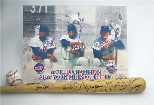 Still vivid in the minds of Mets fans is the year of the 1969 Miracle Mets, led by the guidance of Gil Hodges and the pitching of Tom Seaver. Celebrate the year the Amazin’s stunned the sports world by claiming the World Championship with this great trio of team signed items: Adirondack 302 Gil Hodges signature model signed by 21 Mets including Ryan, Seaver, Swobada, Koosman, Kranepool, Agee, & more. NRMT. NRMT ONL (Coleman) ball with 24 blue ink signatures including Ryan, Seaver, McGraw, Koosman, Berra, Kranepool, & more. 16x20” full color photo of Agee, Svobada & Jones, signed by all three in blue sharpie. NRMT.